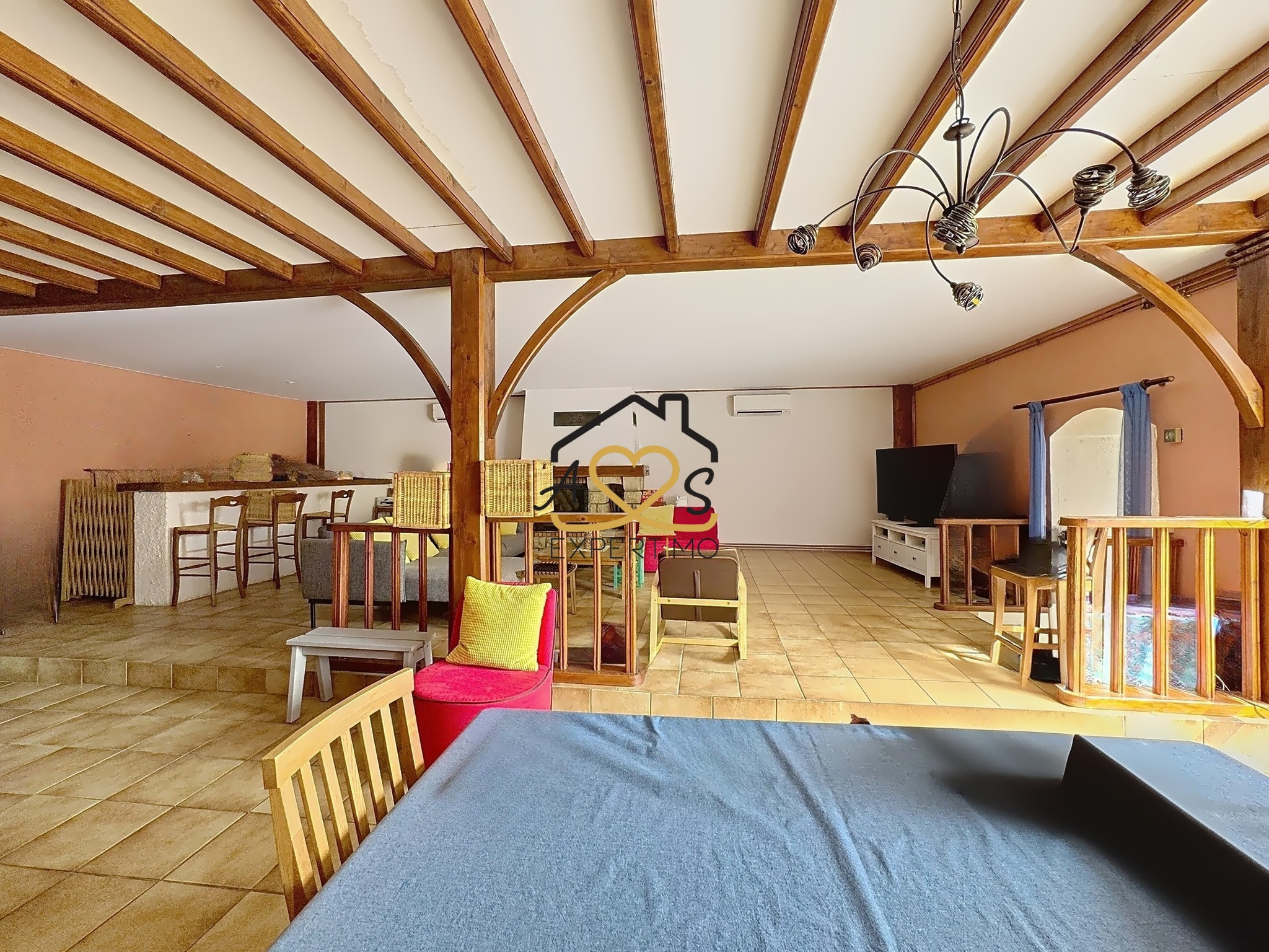 Une belle pièce de vie de 80 m2 lumineuse, comprenant un insert à bois, un bar, et donnant accès à la buanderie de 10 m2 avec placard intégré.